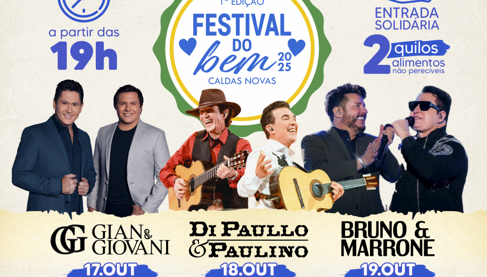 De 17 a 19 de outubro, a cidade celebra seus 114 anos com a 1ª edição do Festival do Bem — um evento que mistura música boa, solidariedade e muito amor por Caldas Novas e Goiás.