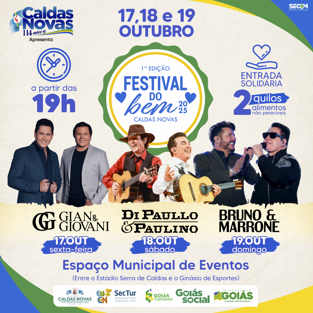 O Festival do Bem é uma realização do Governo de Goiás, Goiás Turismo, Goiás Social e Prefeitura de Caldas Novas, unindo entretenimento e solidariedade em um único evento.